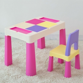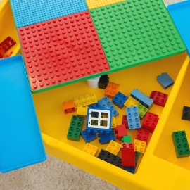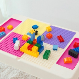 4.設(shè)計(jì):①雙面桌面可直接搭配樂(lè)高等積木玩具。② 供不同年齡兒童使用的抬腳桌子。③ 水可以放在桌子中間,用水玩具。